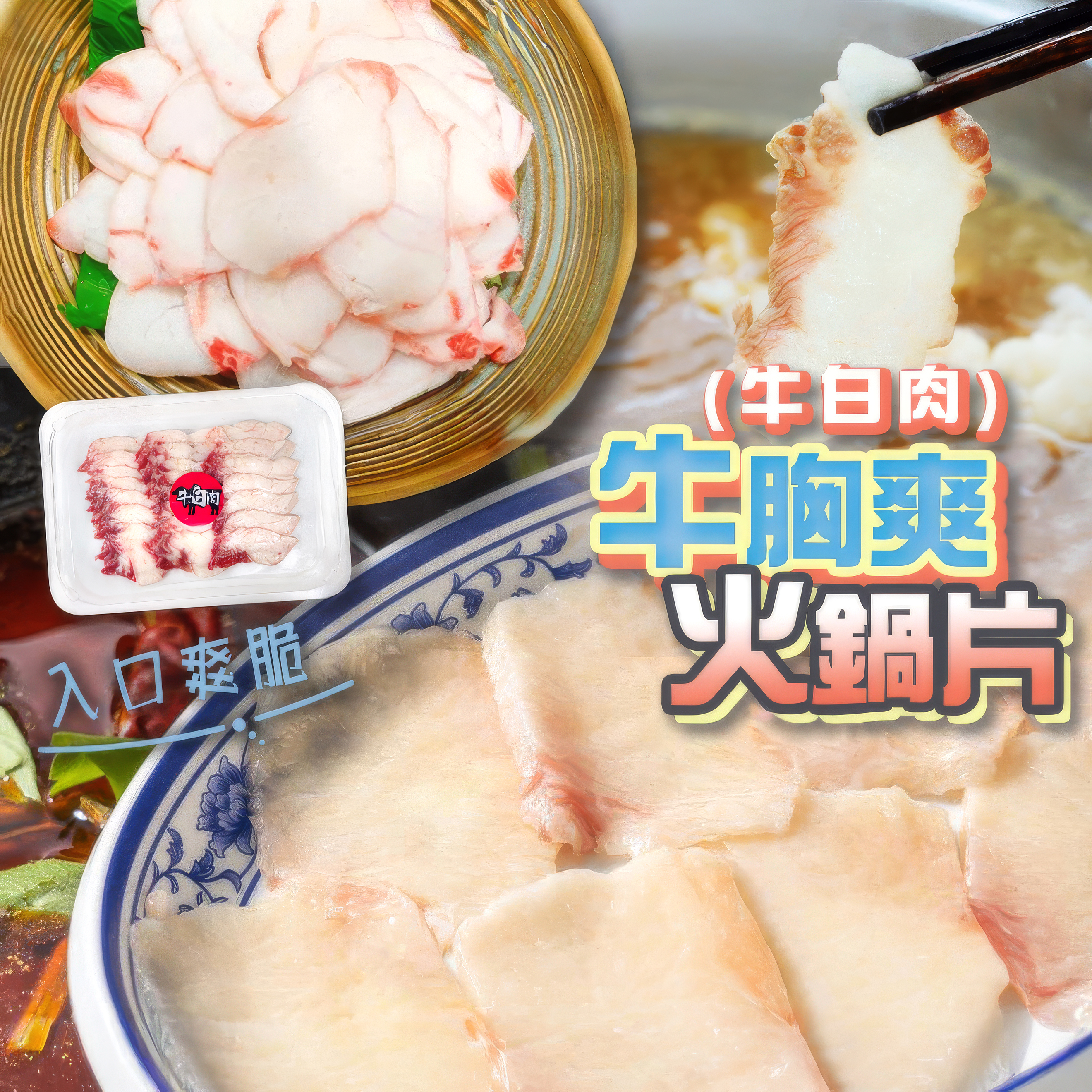 牛胸爽是又名牛白肉,是一個十分珍貴部位,位於牛胸前肋骨上的一塊筋膜類肌肉,含有豐富骨膠原,由於切開時連同附近的牛肉一同切下,故有少許肉味。適合火鍋,輕灼後食用,入口爽脆,油香隨後散發。 建議食法:一片牛胸爽夾著一片牛肉,一起進食口感層次能加倍提升。